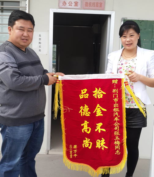 5月4日,乘客蔣女士從市出租汽車(chē)公司領(lǐng)回丟失的蘋(píng)果iphone5s手機(jī),感動(dòng)萬(wàn)分,并送上印有“拾金不昧品德高尚”錦旗,以表達(dá)對(duì)的姐張玉梅的謝意。